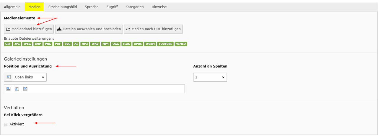Im Tab "Medien" können Sie ein Bild aus Ihrer Dateiliste hochladen, indem Sie "Mediendatei hinzufügen" wählen. Anschließend öffnet sich ein neues Fenster, wo Ihre Dateiliste angebildet wird. Außerdem haben Sie noch die Möglichkeit die Position Ihres Bildes zu bestimmt – dies tätigen Sie bei "Position und Ausrichtung". Wenn Sie das Bild im Frontend durch einen Klick vergrößern wollen, steht es Ihnen das auch zur Verfügung ("Bei Klick vergrößern")
