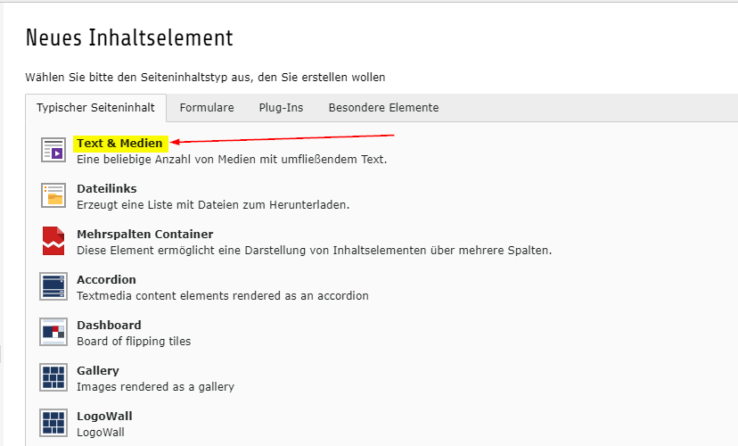 Sie haben noch die Möglichkeit im Element "Text & Medien" ein Bild hinzuzufügen. Sie beginnen wie oben bereits beschrieben.
