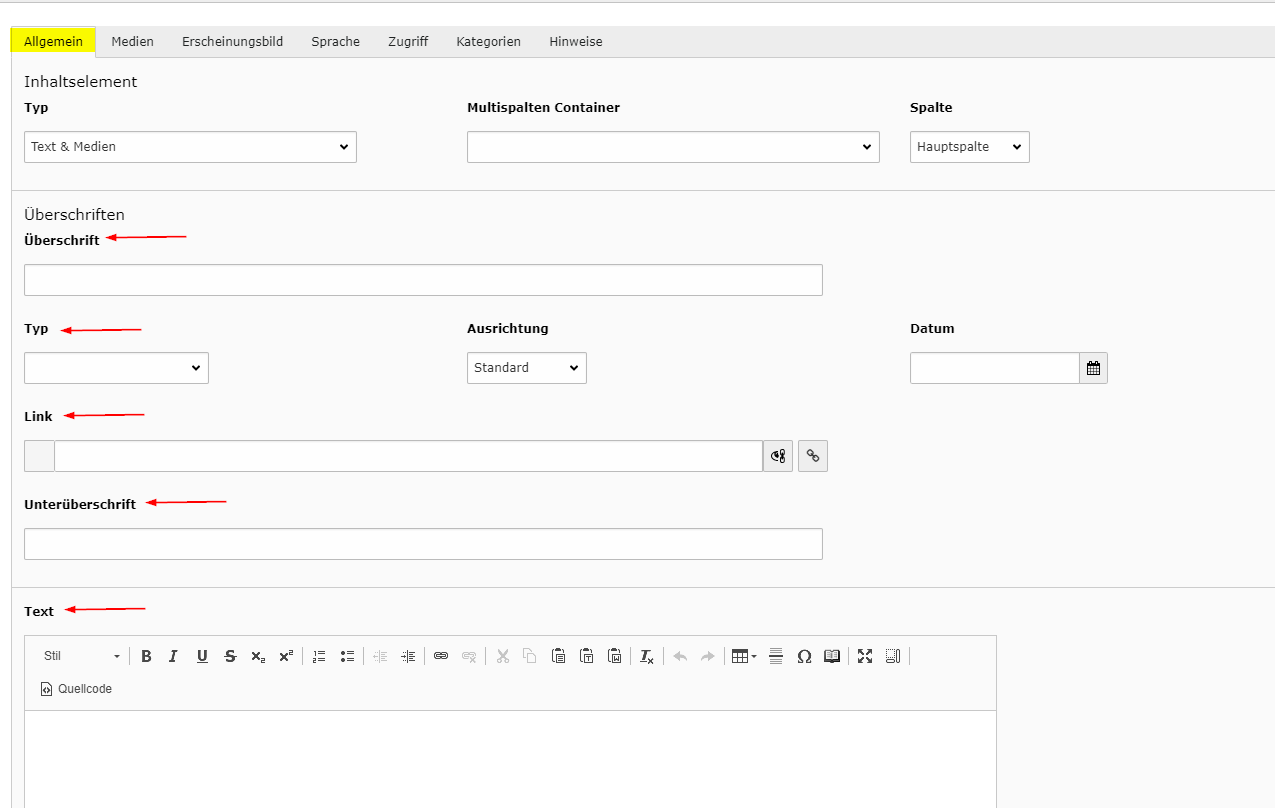 Im Bereich "Link" können Sie Ihre Überschrift verlinken. Der CKEditor (ehemals RTE) steht Ihnen ebenfalls zur Verfügung. Probieren Sie sich aus – die verschiedensten Möglichkeiten finden Sie ebenfalls in der Sandbox.